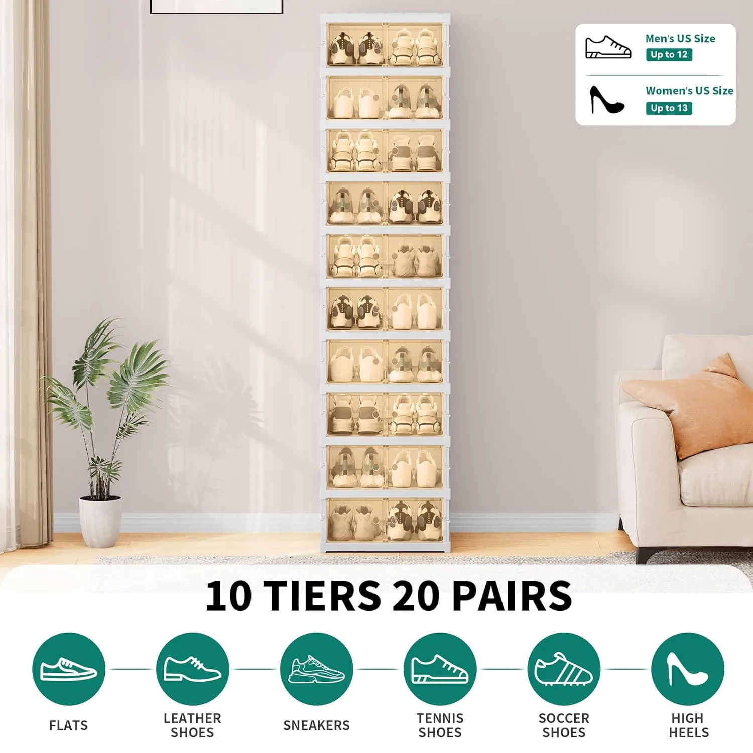10 Tiers-20 Pairs Easy Assembly Shoe Box with Magnetic Doors, Foldable Shoe Storage Organizer for Closet, Collapsible Shoe Rack Sneaker Organizer for Entryway, Living Room, Bedroom (White)