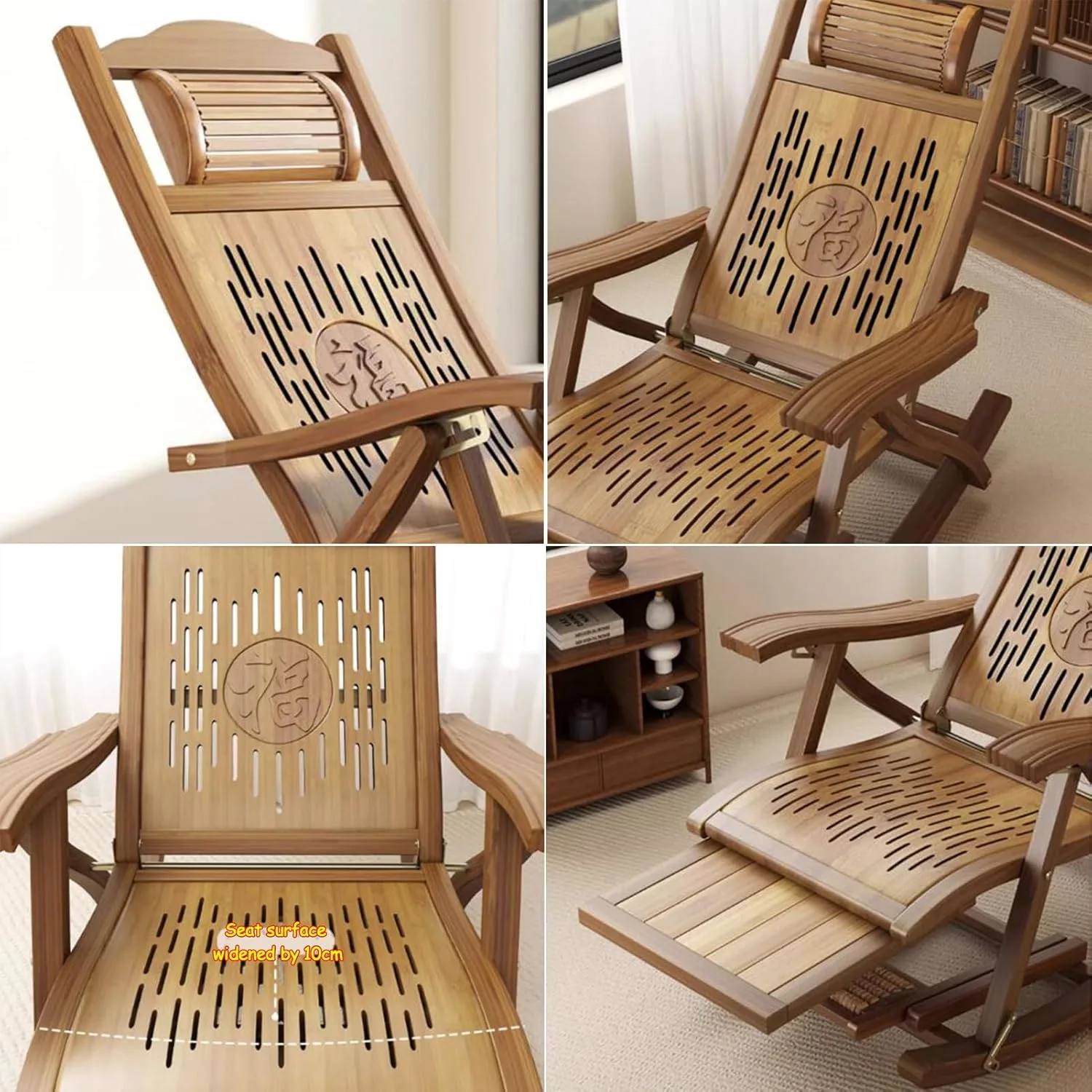 Material-The chaise longue is made of bamboo material, ensuring long-lasting durability and sturdiness. The backrest is hand-carved, the 168° angle can be adjusted in 5 levels, the seat plate is 49cm wide, and the cotton pad is removable;
