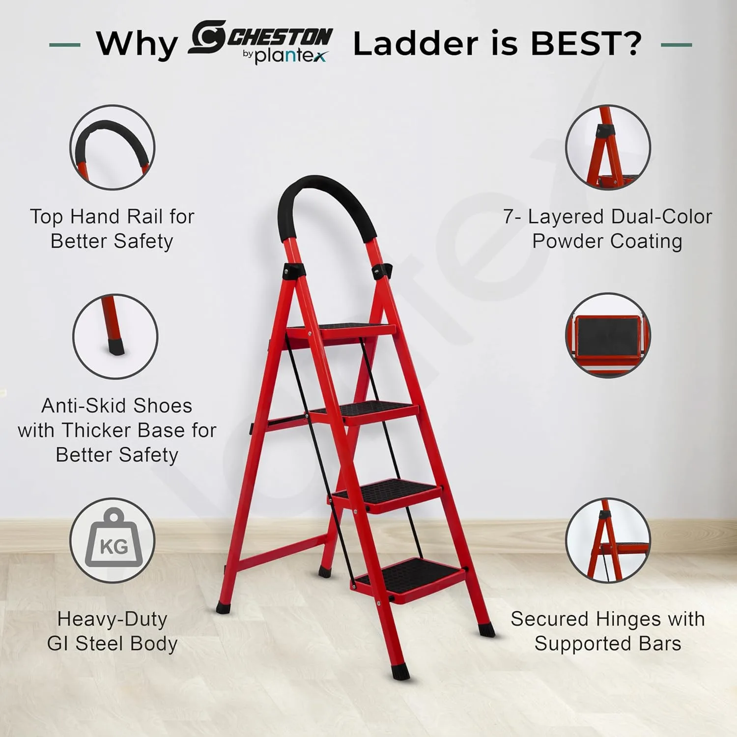 ๐๐๐ญ๐๐ซ๐ข๐๐ฅ: Plantex folding 4 step ladder is made from high strength durable GI Steel pipe which is coated 7 times with processed powder. Ladder for home is super secure and stable.