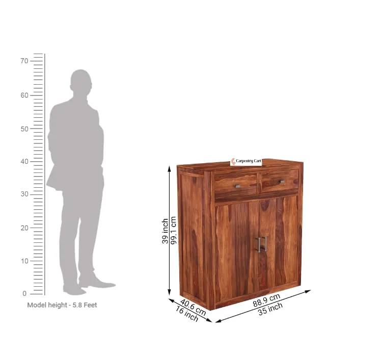Material:- Sheesham wood | Dimensions (cm):- 88.9 L x 40.6 W x 99.1 H | Type: Floor Standing | Storage Type:- Closed | No. of Drawers:- 2, No. of Doors:-2