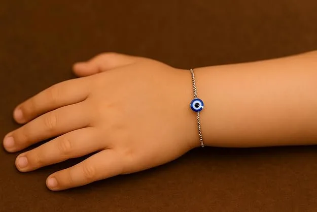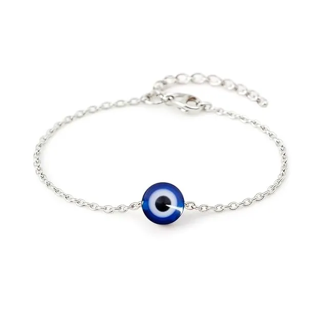Traditionally believed to protect against negative energy and unwanted attention, the evil eye charm adds a sense of calm and reassurance to your accessories collection. The smooth, polished finish of the charm reflects light gently, while the carefully crafted chain ensures a balanced and graceful appearance. Whether worn alone or layered with other bracelets, it enhances your look with a blend of simplicity and symbolism that never goes out of style.