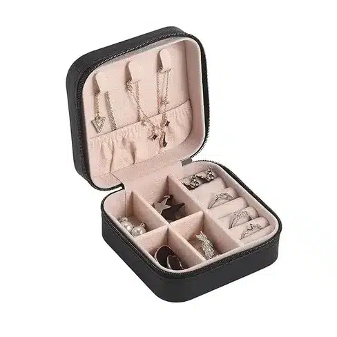 This jewelry organizer also includes necklace hooks and an elastic pocket inside the lid, designed to keep chains and necklaces from tangling. The secure zipper closure ensures that all your valuables remain safely stored inside while protecting them from dust, moisture, and accidental spills.